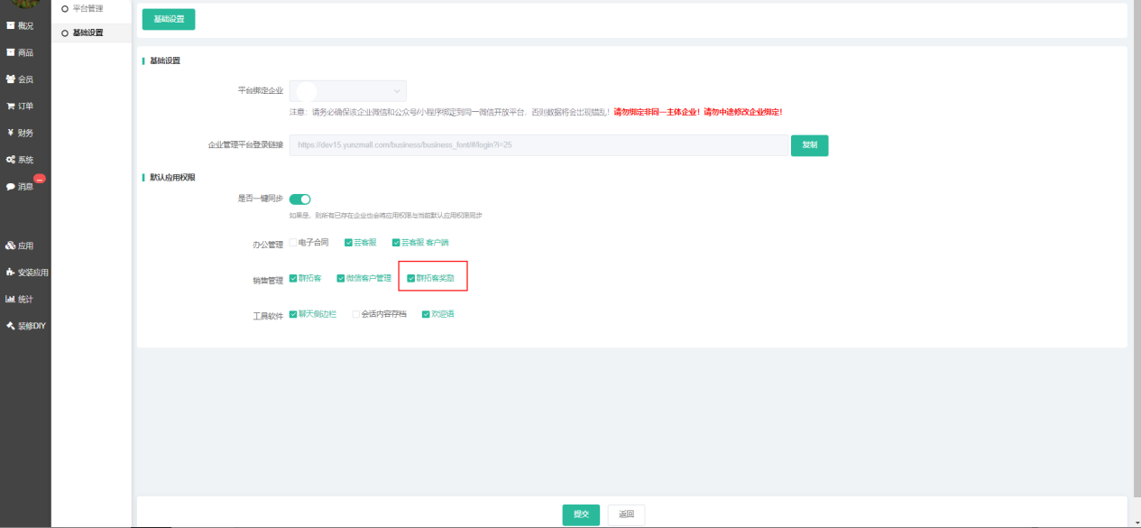 1、后台--应用--企业管理平台—>勾选群拓客奖励应用权限