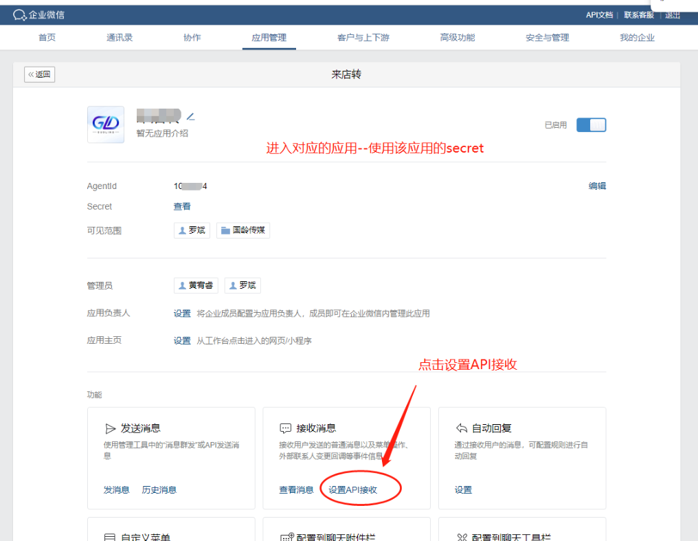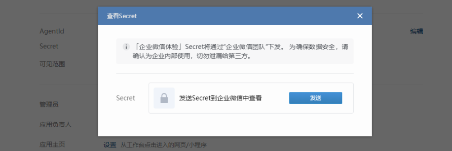 Secret填入后台设置中的AgentSecret;获取Secre时需要在微信客户端二次确认获取。