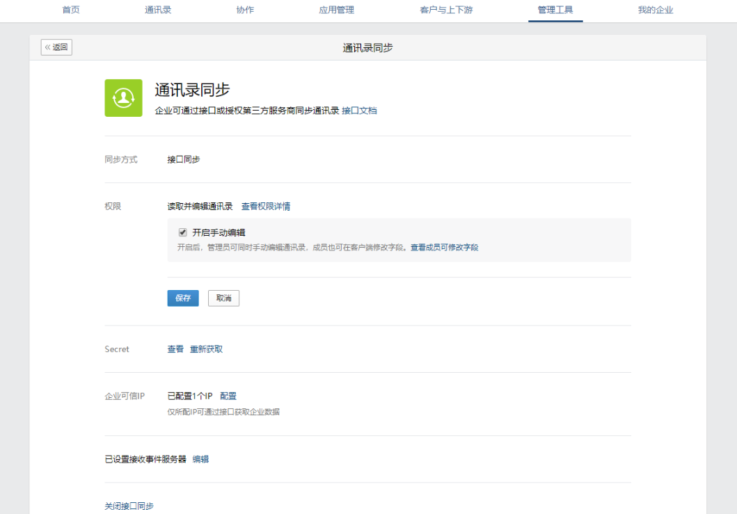 企业微信官方后台 -- 管理工具 -- 通讯录同步