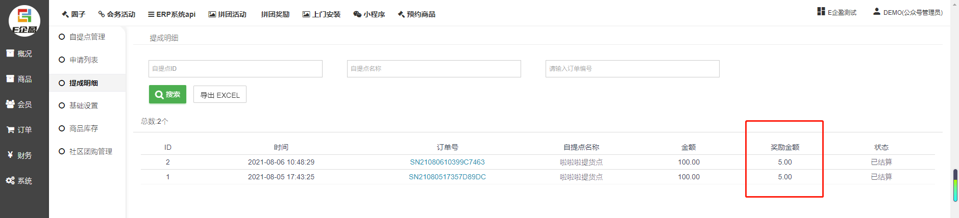 订单总数、本团总收入:统计完成核销的订单总数和自提点团购订单奖励