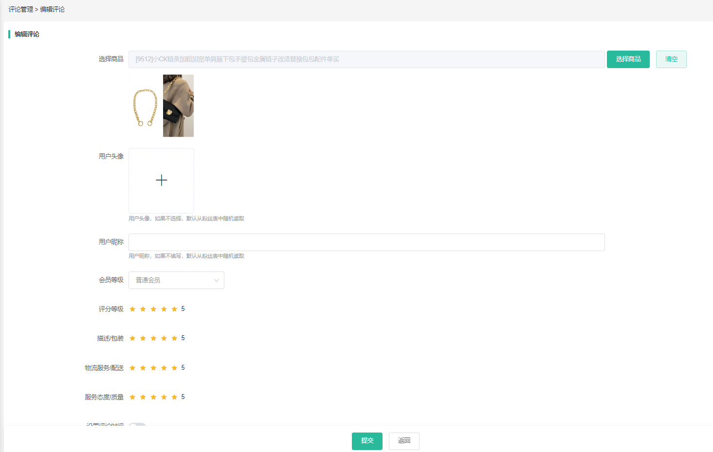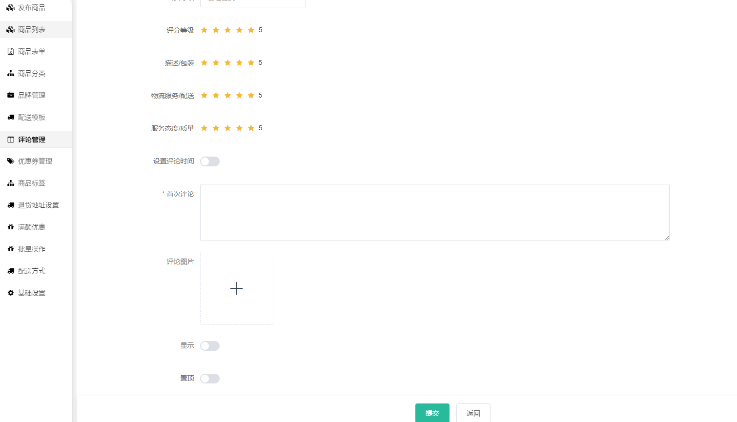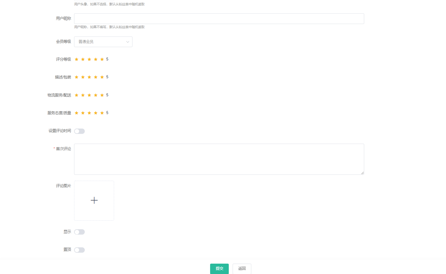 4、可以后台添加商品虚拟评价信息:用户头像、用户昵称、评分等级、首次评价等。