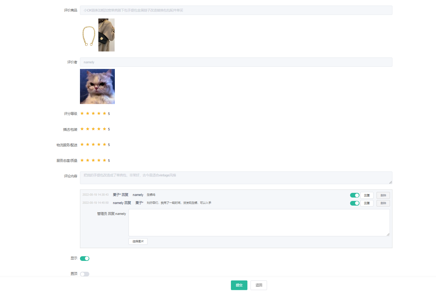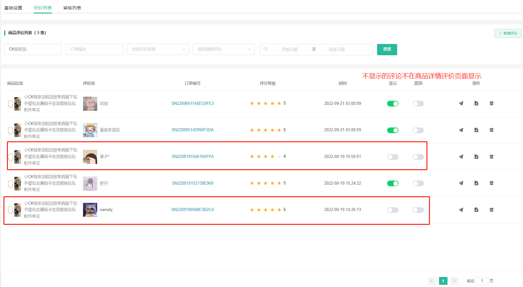 3、是否显示、置顶评价