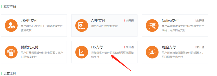 使用微信支付及H5端支付,商户号产品中心务必开启JSAPI支付和H5支付