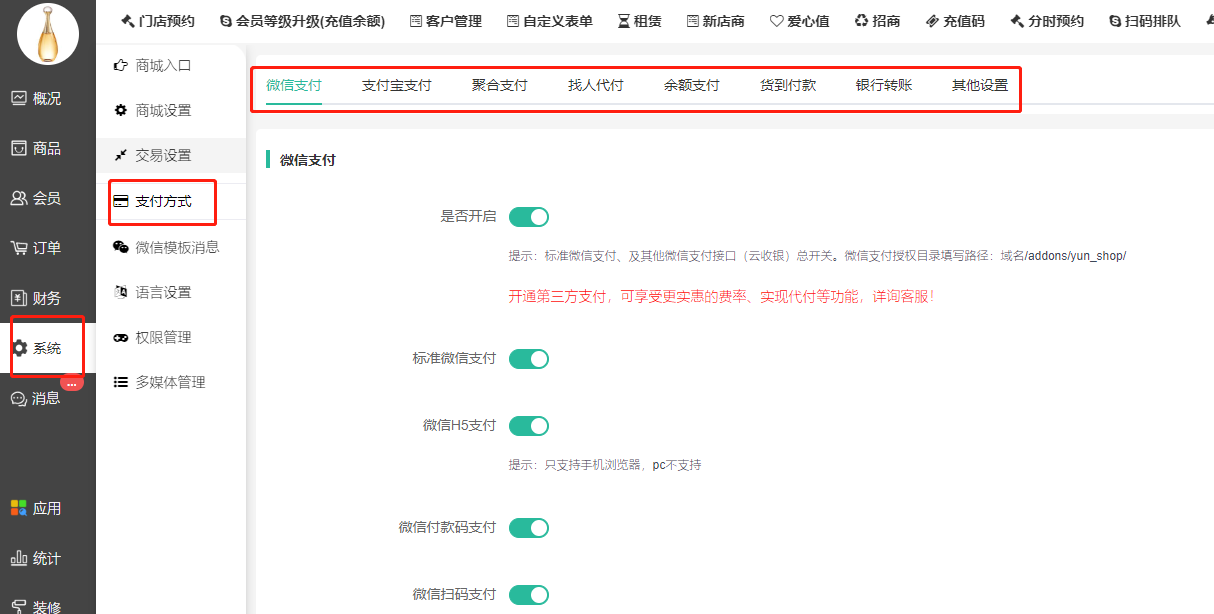 微信支付配置(路径:后台系统--支付方式--微信支付--开启微信支付和标准微信支付)