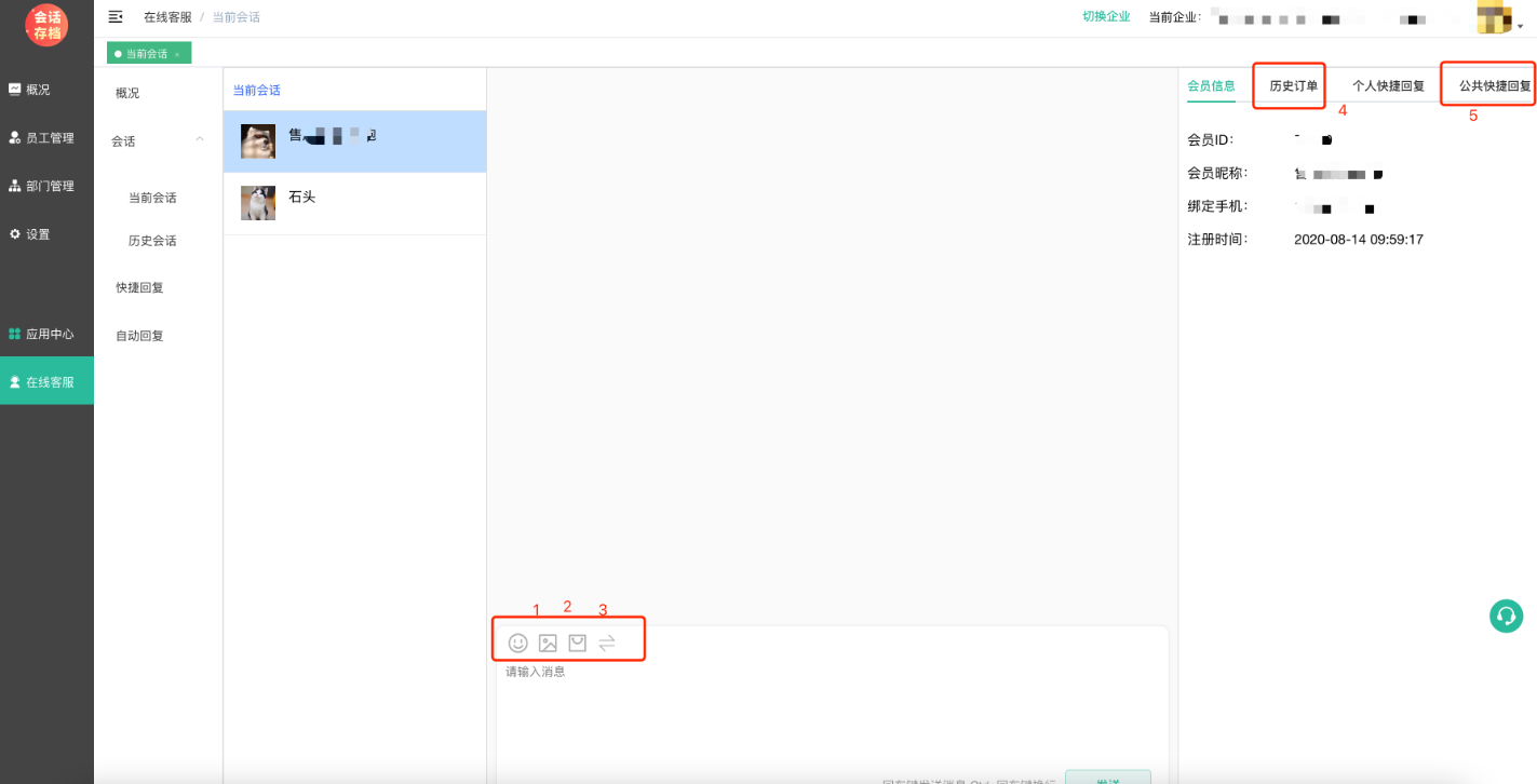 下图为客服端客服在线会话窗口,对应的数字代表聊天设置内容: