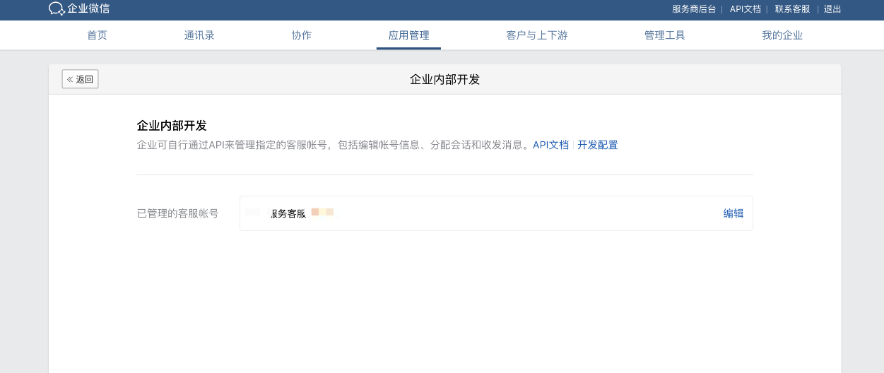在企业微信管理后台(官方)--应用管理--微信客服中,拉到最后,找到通过API管理微信客服账号--企业内部开发,进行客服账号授权