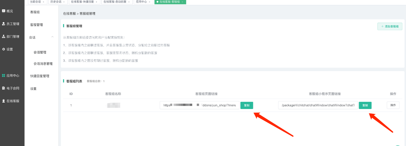企业管理PC端--在线客服--客服组,可获取对应客服组的链接、路径: