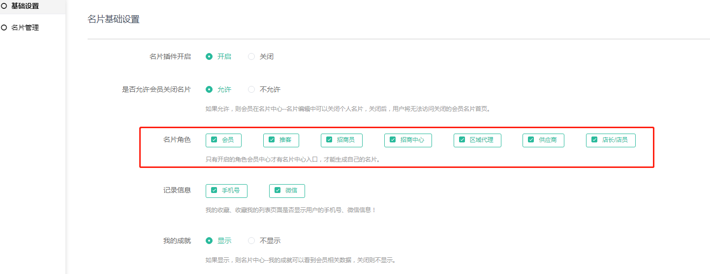 3,名片角色:只有开启的角色会员中心才会有名片中心入口,才能生成自己的名片;生成的角色默认为会员;禁用插件则名片角色处不会显示这个插件【店长/店员为门店店长和核销员】